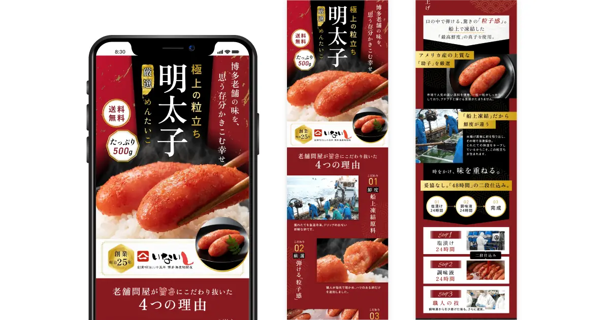 老舗水産加工会社様の明太子を楽天で販売するためのLPを制作しました。